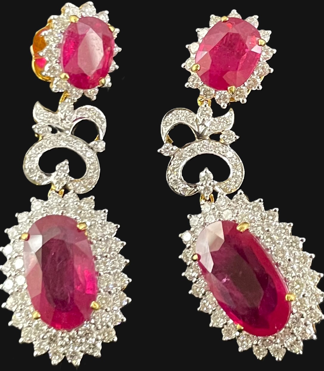 Luxurious earrings, large pink gemstones surrounded by diamond, 18k gold case, suitable for girls.