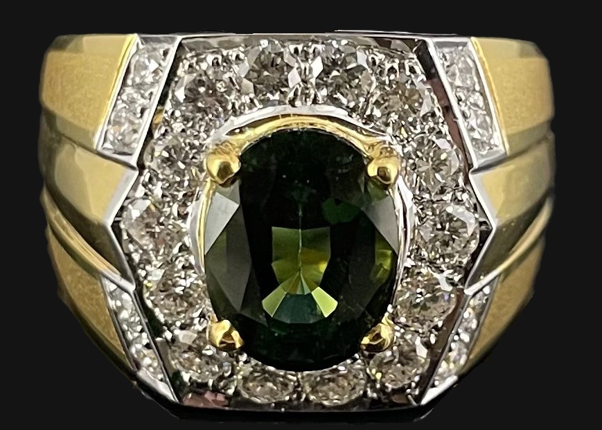 Striking and sophisticated, this exquisite ring (CJ5548) features a captivating 2.82-carat deep green sapphire at its heart — a bold expression of natural beauty. Framed by 1.09 carats of brilliant white diamonds (VVS–VS clarity), the design is set in 18K gold, weighing 9.628 grams. This luxurious piece blends rich color with refined sparkle, making it a timeless addition to any fine jewelry collection.